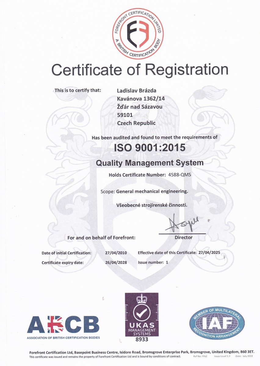 Certifikáty - Kovovýroba Brázda - zámečnictví, nerezová výroba, tváření za studena, svařování, třískové obrábění